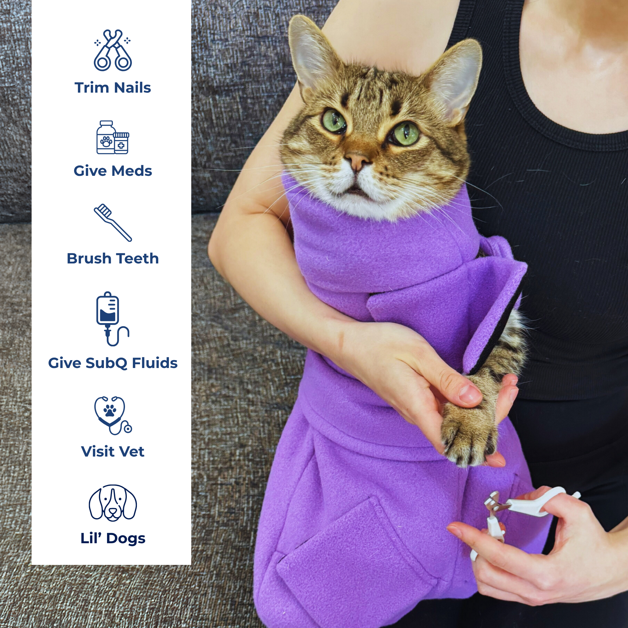 Our Pro Wrap was designed by a vet to allow for a full vet exam while your cat is wrapped up, so they can stay calm and comfortable through the whole visit. We do not want the stress of a vet visit to be a barrier to getting the care your pet needs.