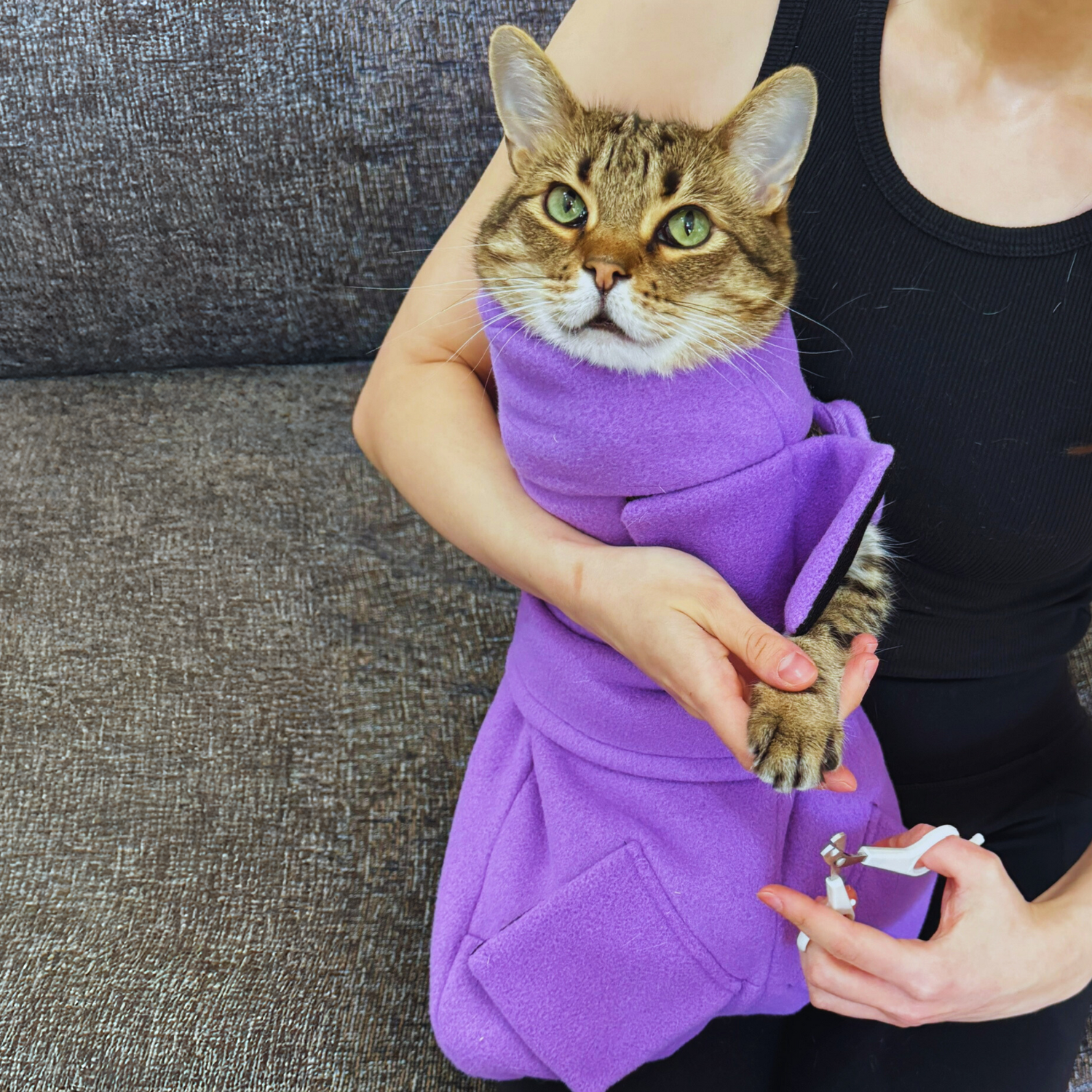 I'm a new cat mom, and I was incredibly nervous about trimming my cat's nails for the first time. He's so squirming and he would constantly nip at me or the clippers, making it impossible to get the job done...until I discovered the calm & cozy cat wrap. It's a little difficult to get him in it, but once he's secure inside, he becomes super calm and docile, and trimming his nails is a breeze.