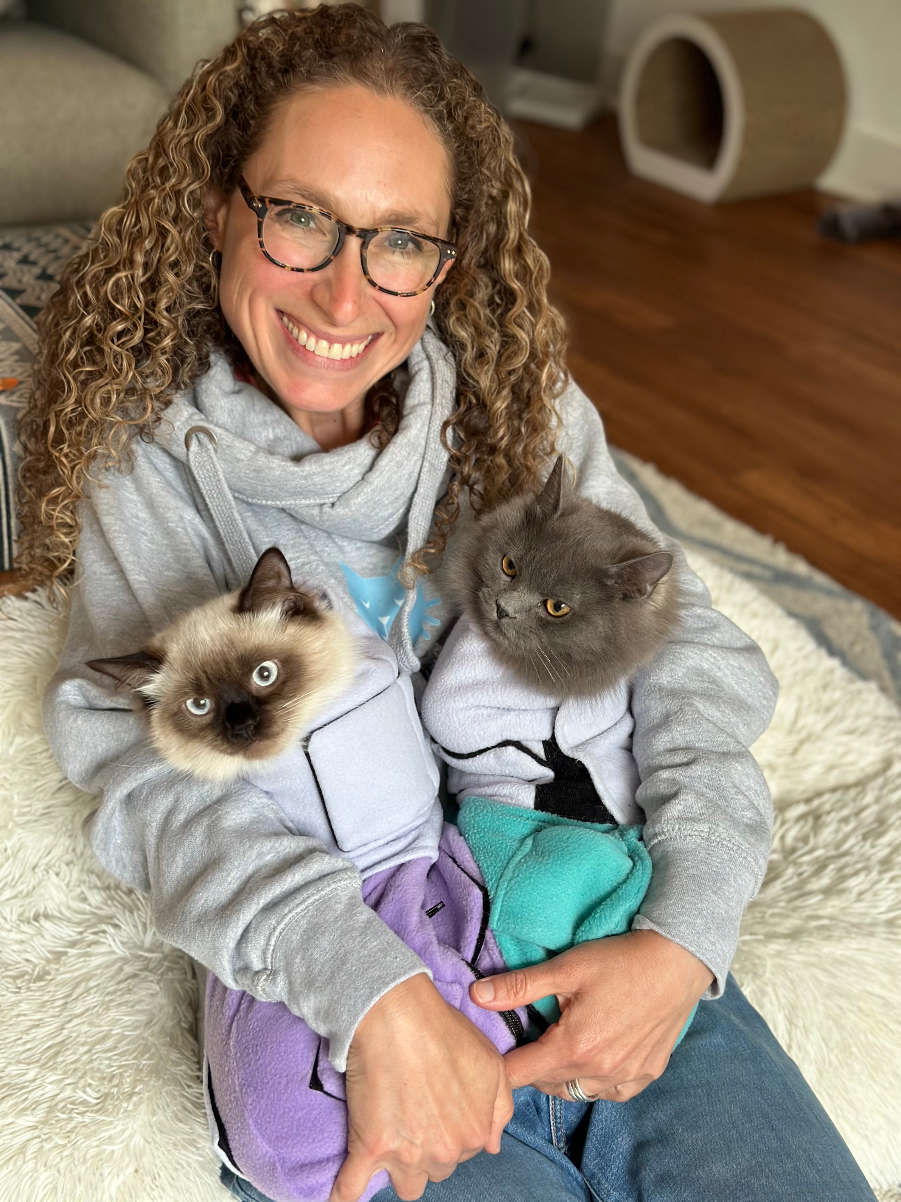 Surell invented the Calm & Cozy Cat Wrap when her veterinary nurse was on maternity leave. She needed a way to handle cats on her own during exams. As a mother of three, Surell was curious to see whether a baby swaddle could be used to calm and hold cats. She started creating prototypes, and after years of testing many different versions, the Calm & Cozy Cat Wrap was born.